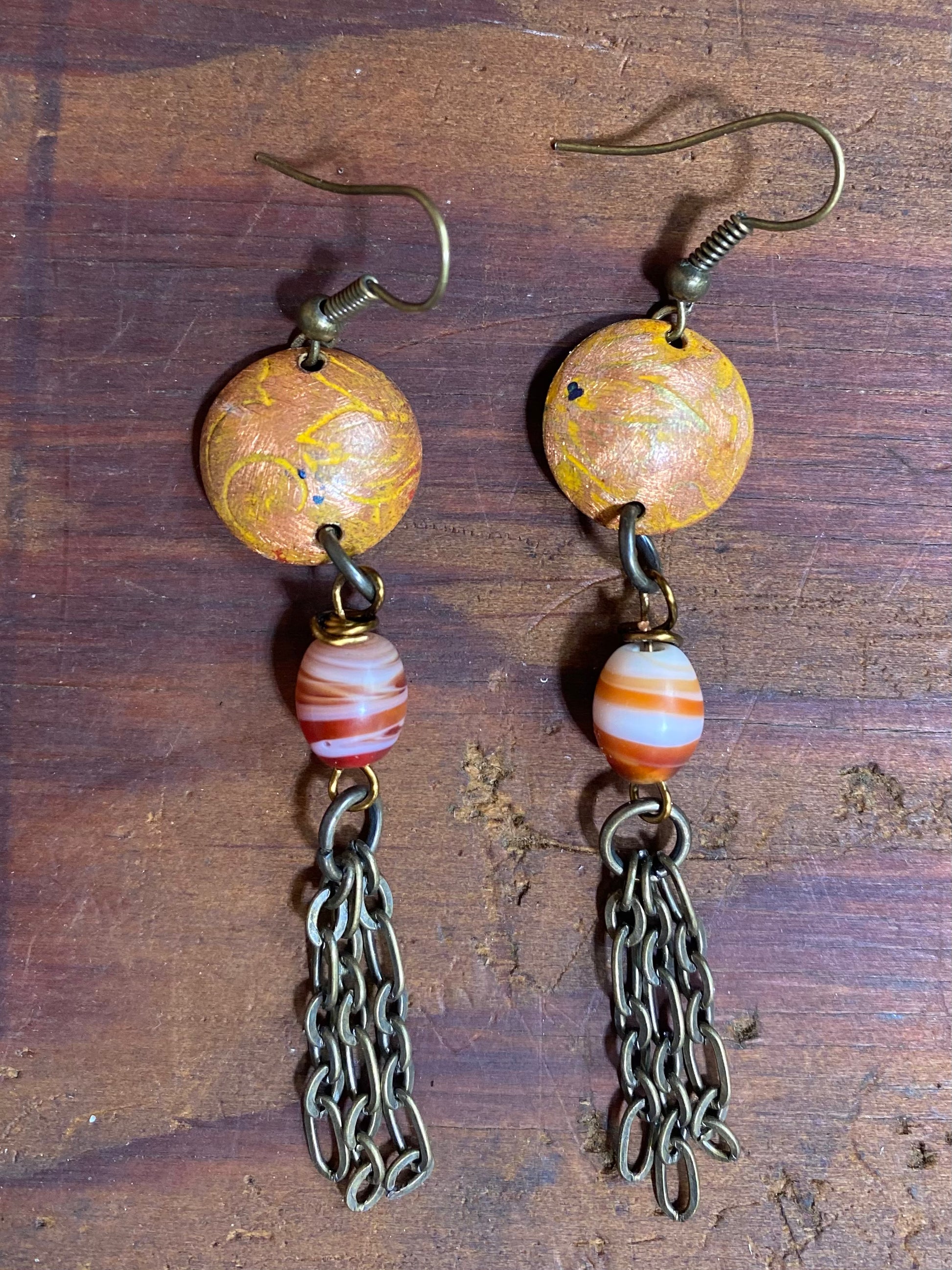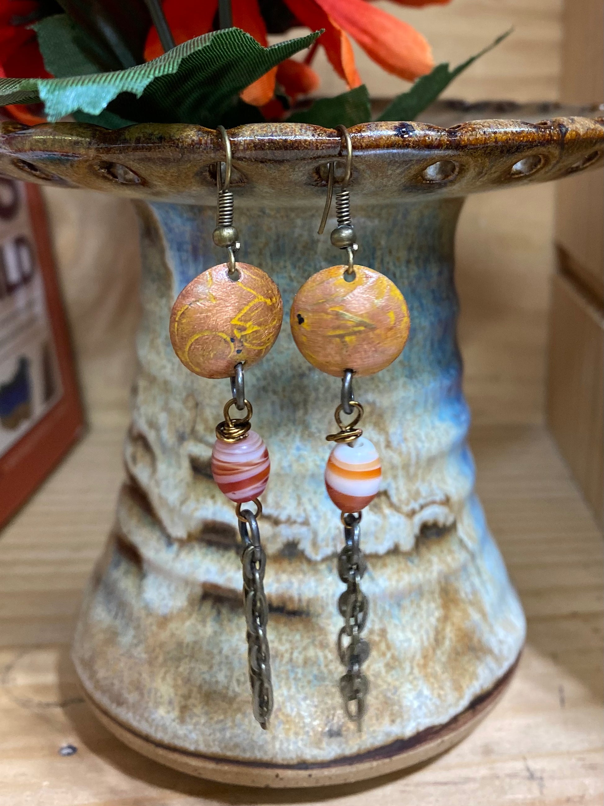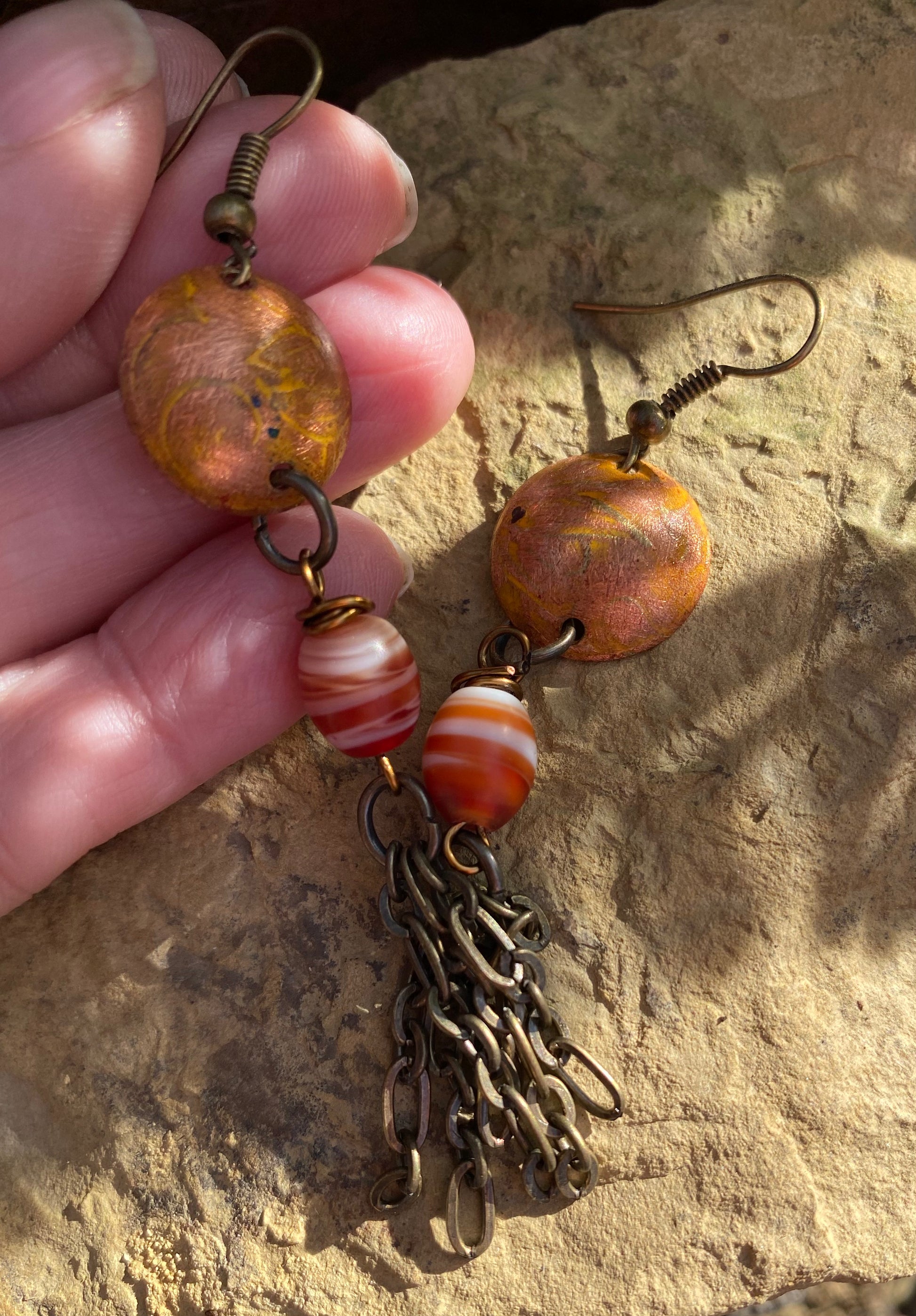 Discover the charm of our Copper dangle earrings. These uniquely designed Bohemian-style pieces are both playful and lightweight, crafted with a hand-cut copper disc, enameled and adorned with a sparkling glass bead and brass chain. An ideal gift for your dear one, these earrings are the perfect way to show your appreciation for handcrafted jewelry.