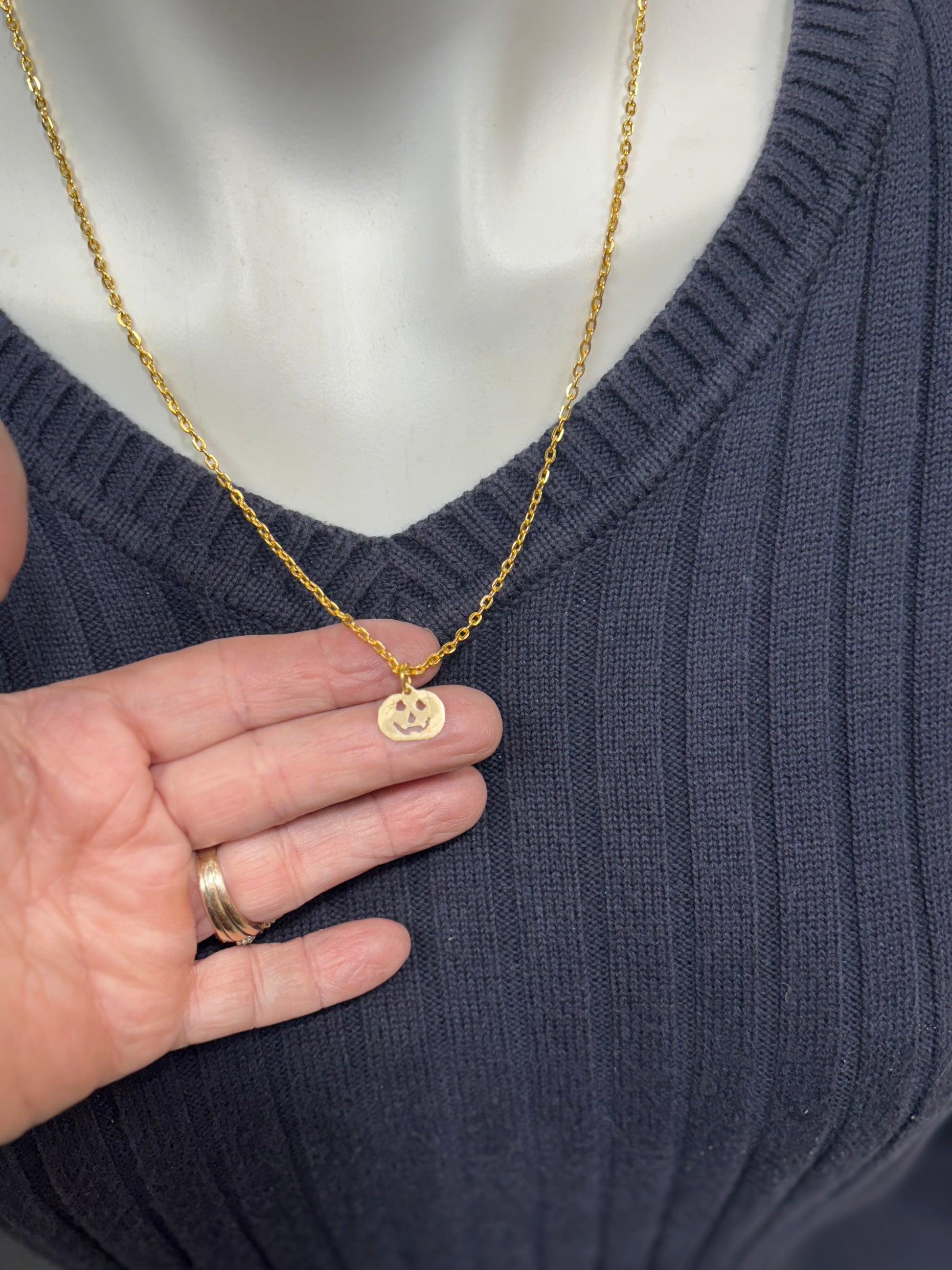 These pumpkin necklaces are available in copper, brass, or silver, can be selected at checkout. The pumpkin pendant adds a refined and charmingly spooky accent to your ensemble. Each pumpkin is carefully hand-cut and polished, giving every face its own unique character. Explore my fall collection for additional elegant fall selections.
