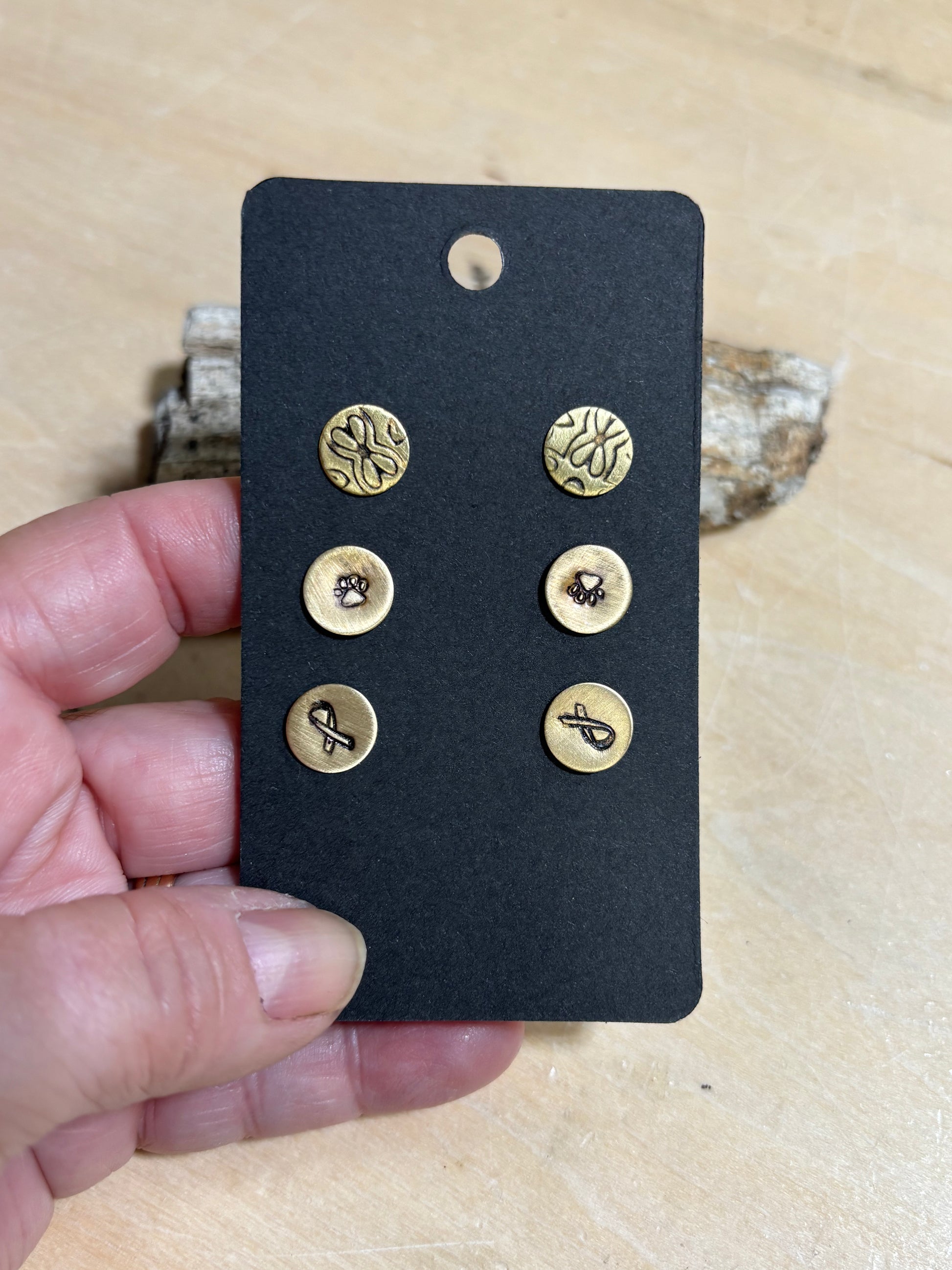 These stamped post earrings are offered in sets of three, each including one pair crafted from sterling silver, brass, and copper. The elegant stamped designs feature options such as Flag, Ribbon, Paw, Heart, Horse, Cross, Lucky Charm and more.