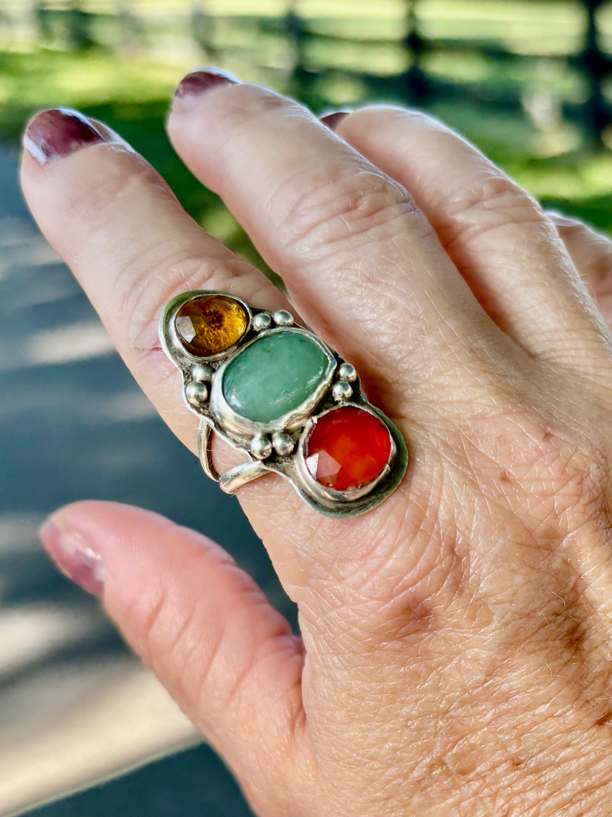 Enhance your fall wardrobe with the Gemstone Trio ring custom made for you. This ring is featuring stunning Citrine, Carnelian, and Aventurine gemstones. While this specific ring is not available I am happy to create a custom one just for you.